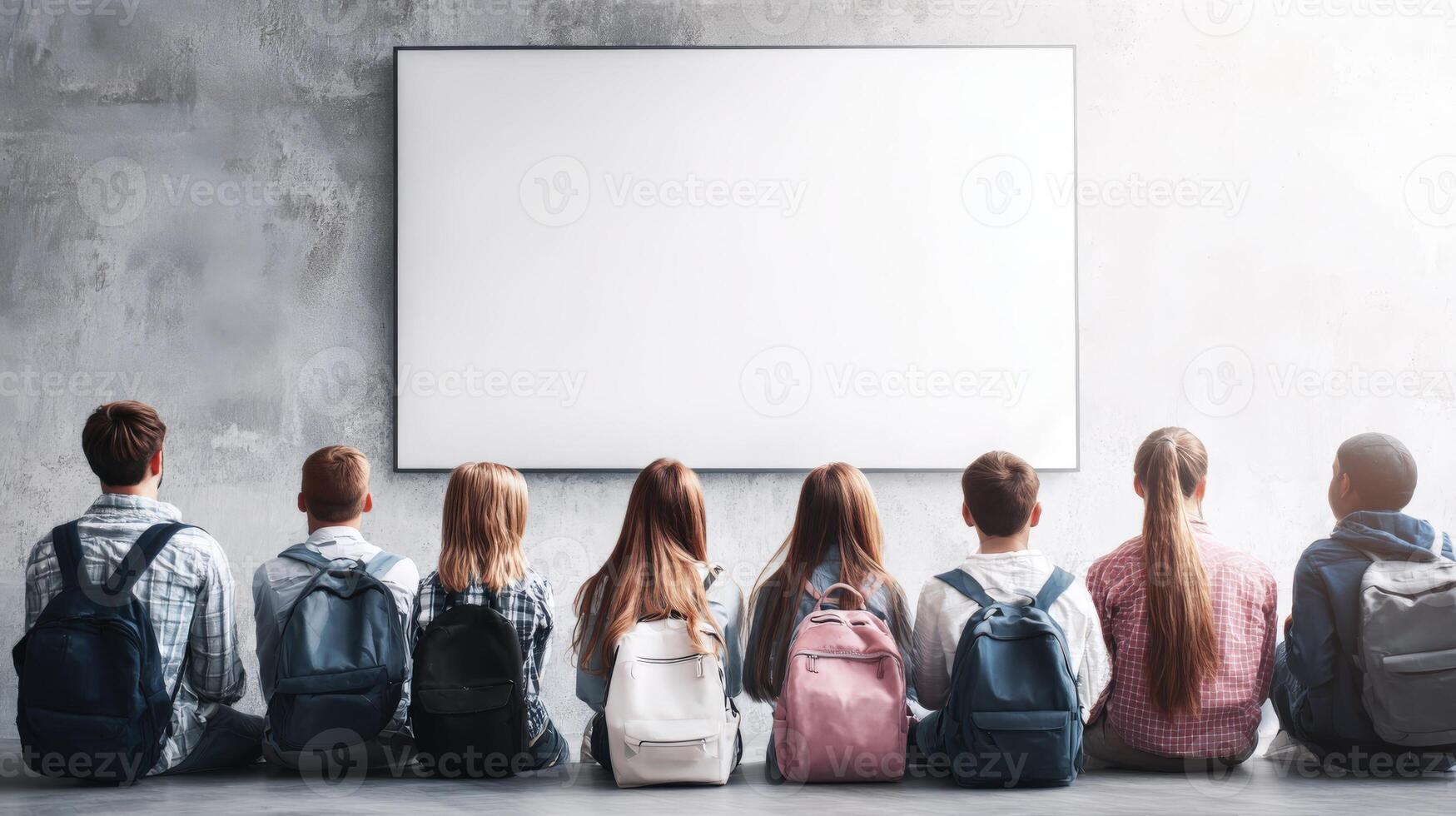 Group of diverse students with backpacks sitting in front of a white canvas frame mockup Pro Photo