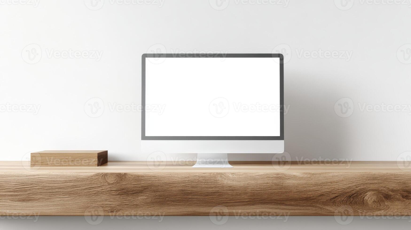 Modern Computer on Wooden Shelf with Blank White Screen for Mockup or Presentation Display Pro Photo