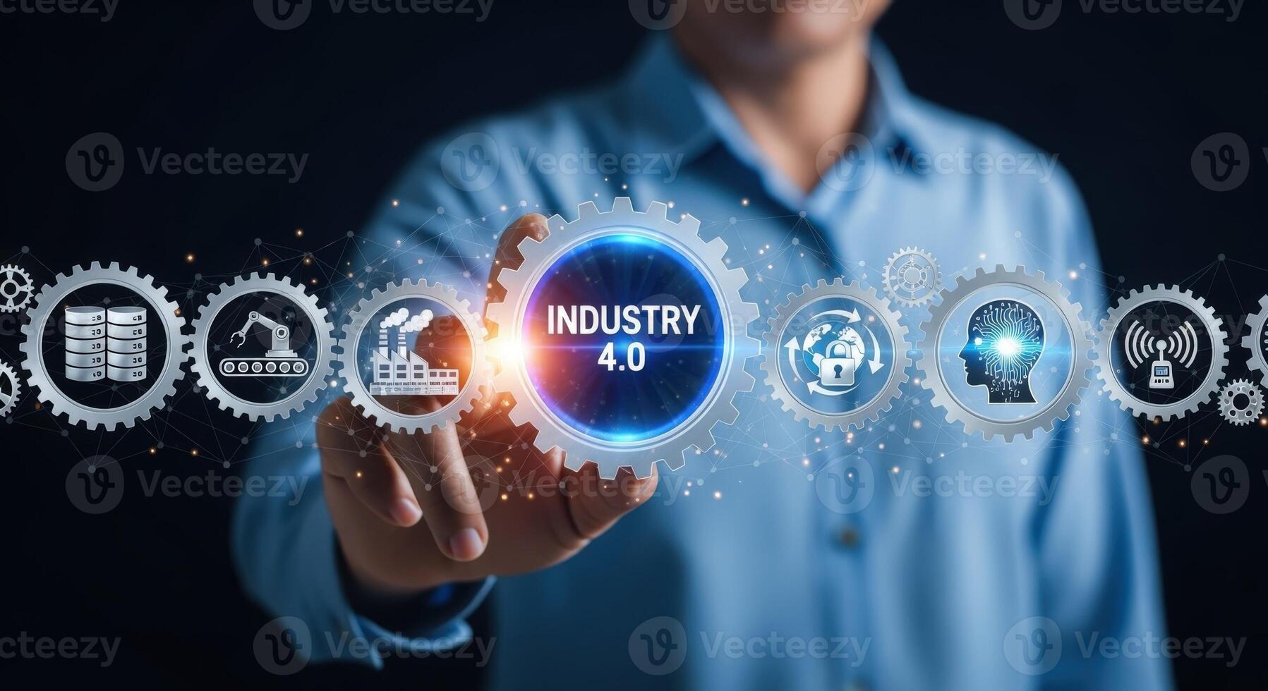 Industry 40 Concept Person touching virtual interface with advanced automation, data exchange, and manufacturing technologies illustrated in gears Pro Photo