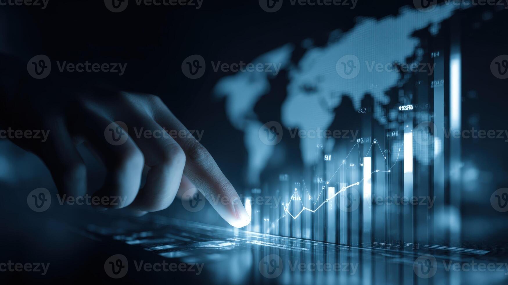 Financial Growth Chart Visualized Hand Interacting with 3D Graph Over World Map Background Pro Photo