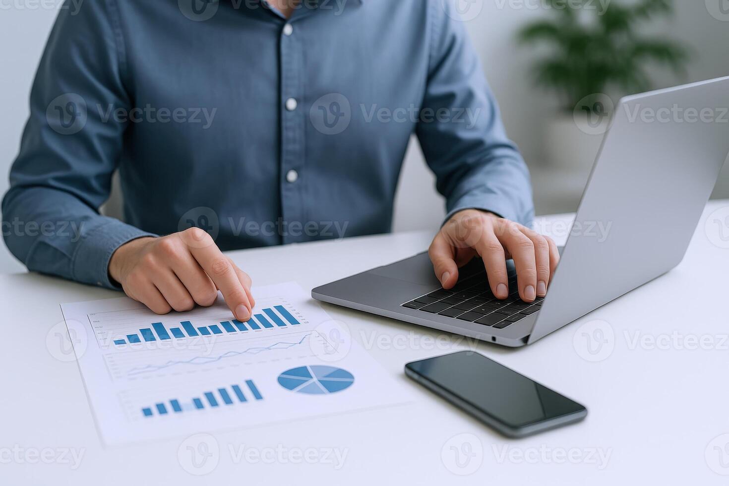 Analyzing Business Data Man Reviews Charts and Graphs on Desk with Laptop and Smartphone Pro Photo