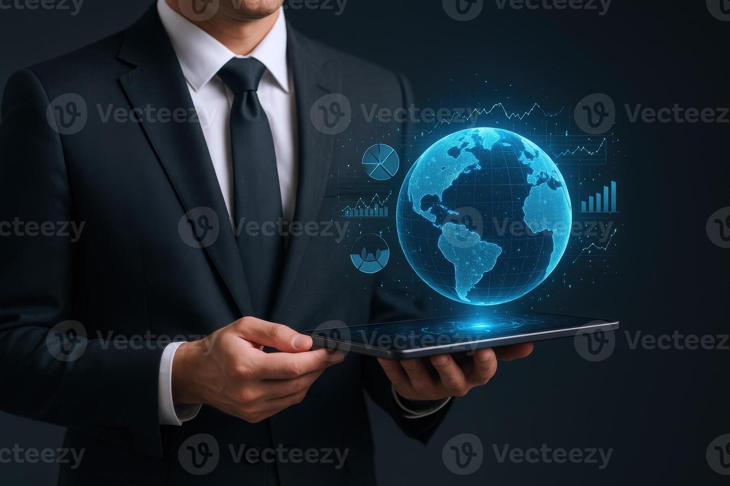 Global Business Connection Businessman Using Tablet with World Map and Data Visualization for International Strategy Pro Photo