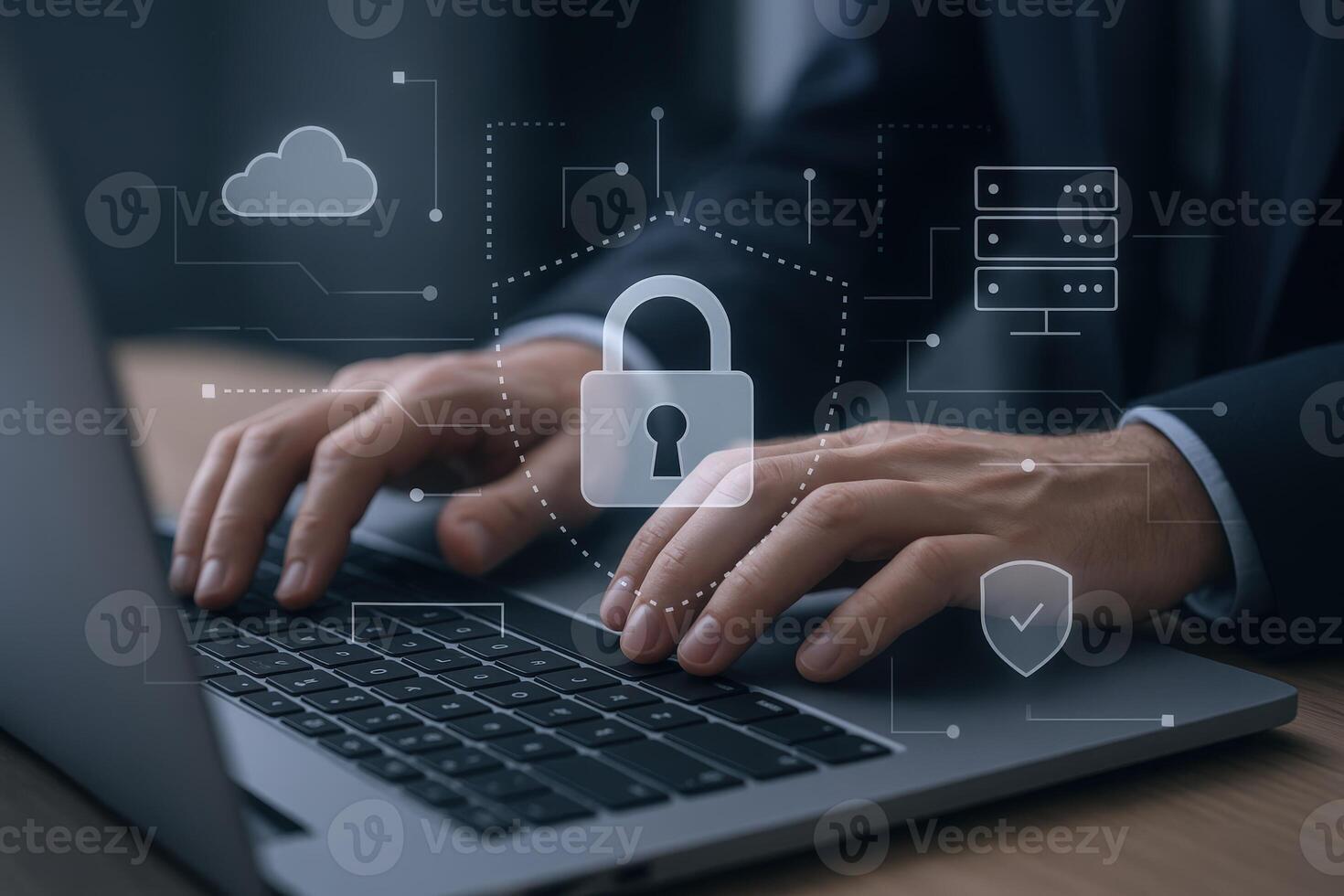 Cybersecurity Professional Working on Laptop with Data Protection Lock and Cloud Security Interface Overlay Pro Photo