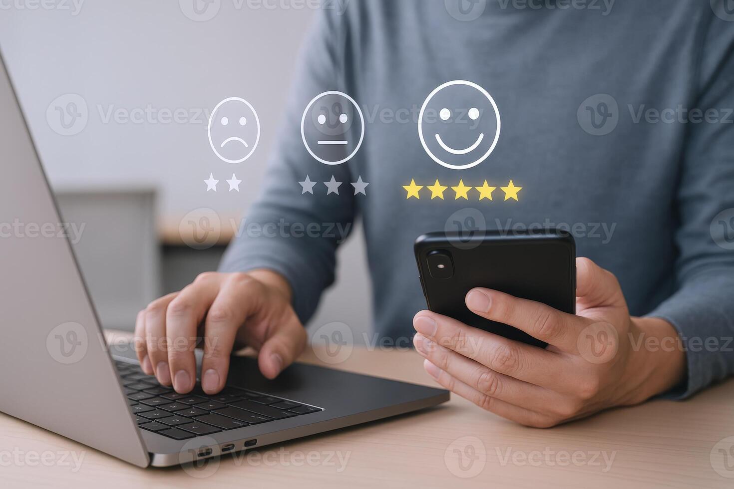 Customer Feedback Evaluation Person Using Laptop and Smartphone to Assess User Experience with Graphic Overlays Pro Photo