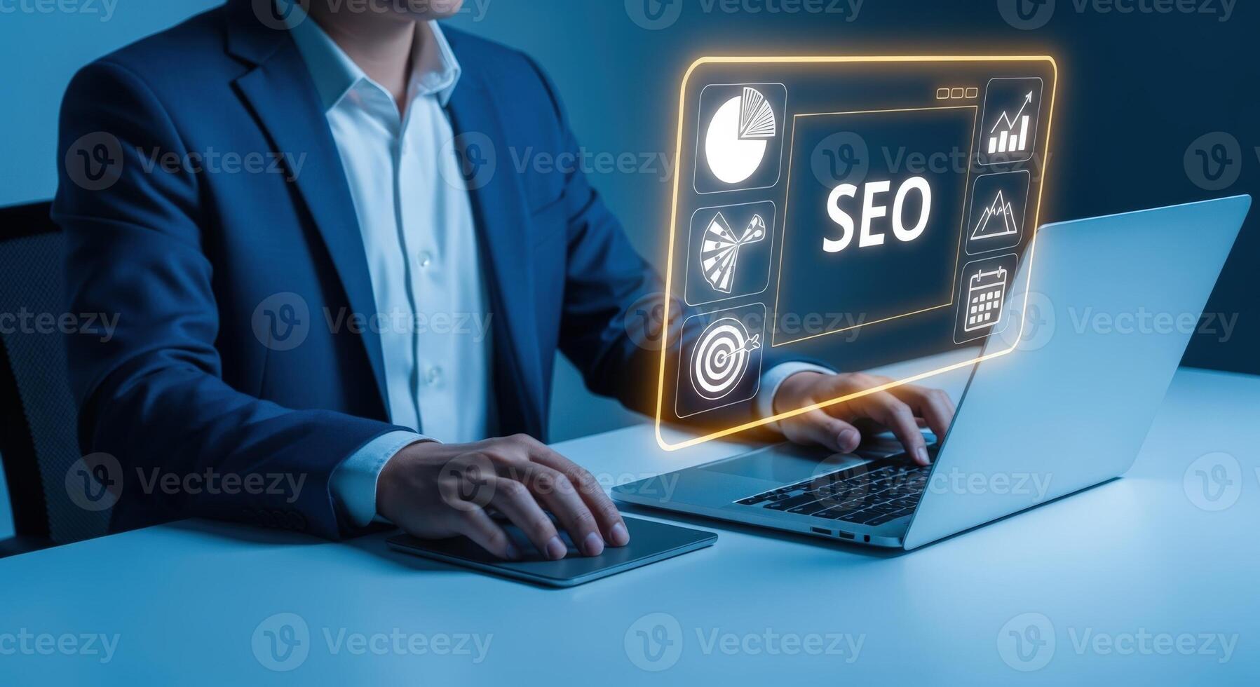 Man in Suit Optimizing Website SEO Strategy with Laptop and Digital Interface Display Pro Photo