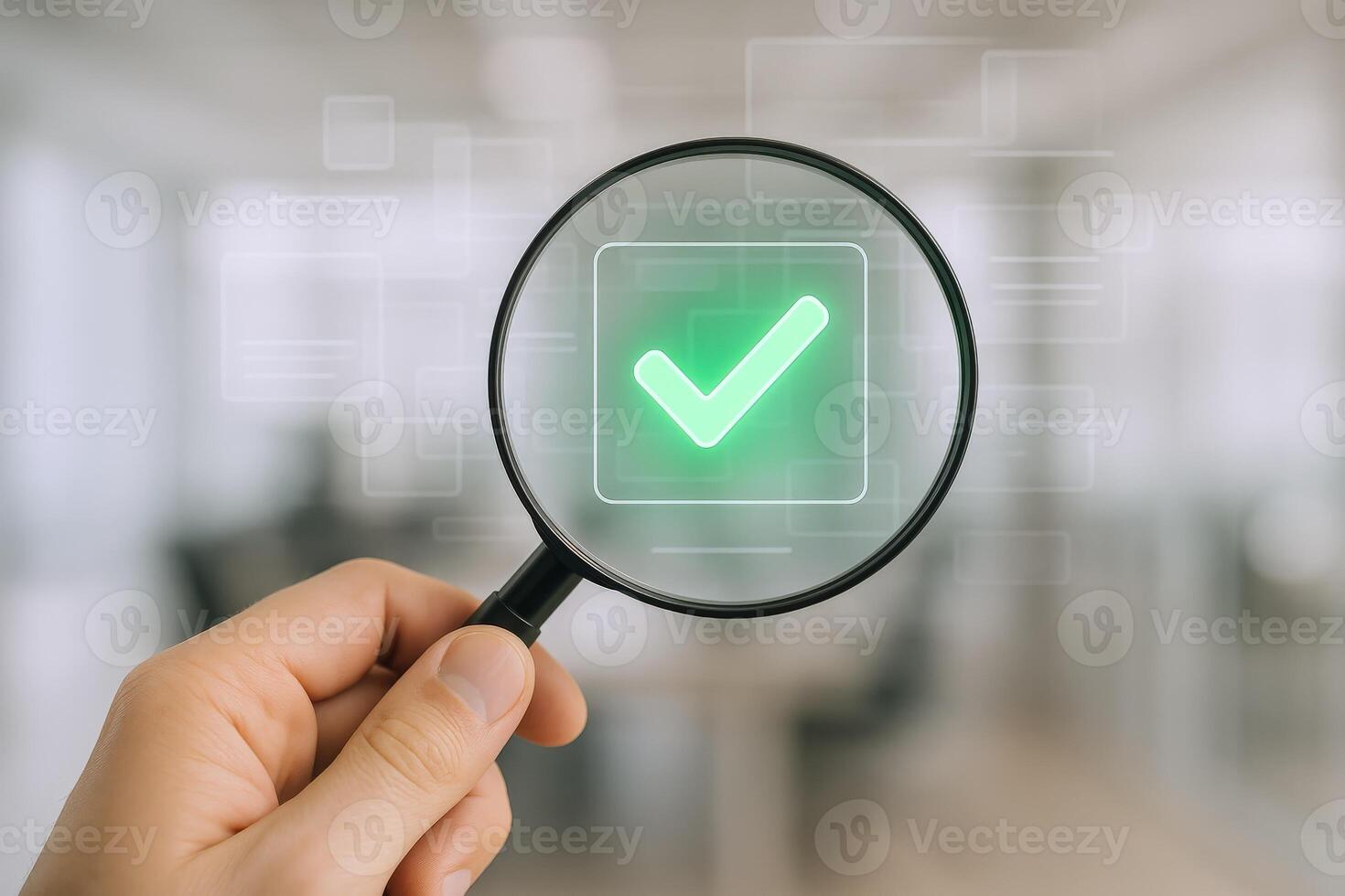 Magnifying Glass Examining Check Mark Quality Assurance, Verification, and Business Approval Concept Pro Photo