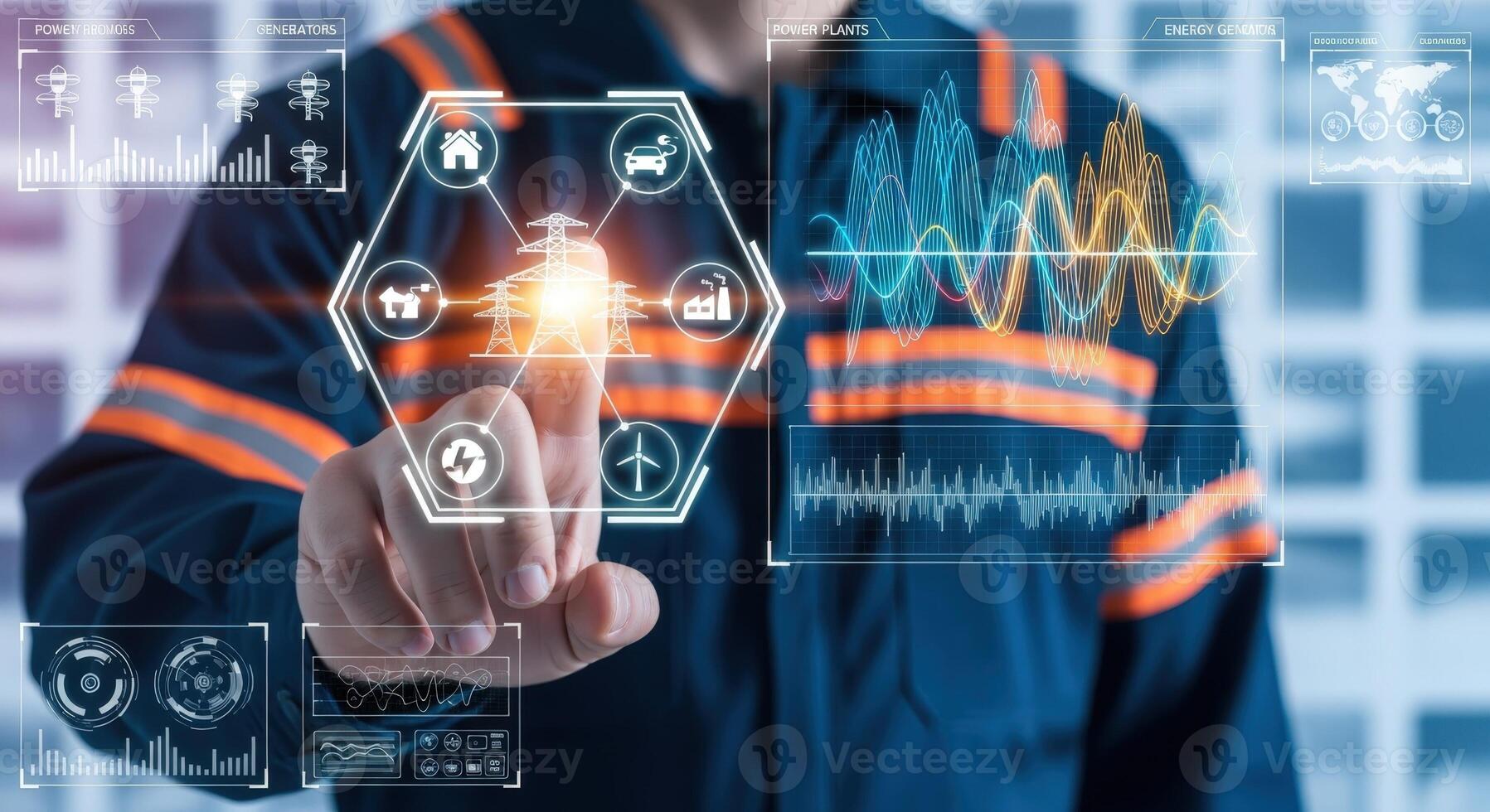 Electrical Engineer Interacting with Futuristic Interface Displaying Energy Distribution and Smart Home Technology Solutions in Modern Grid Pro Photo