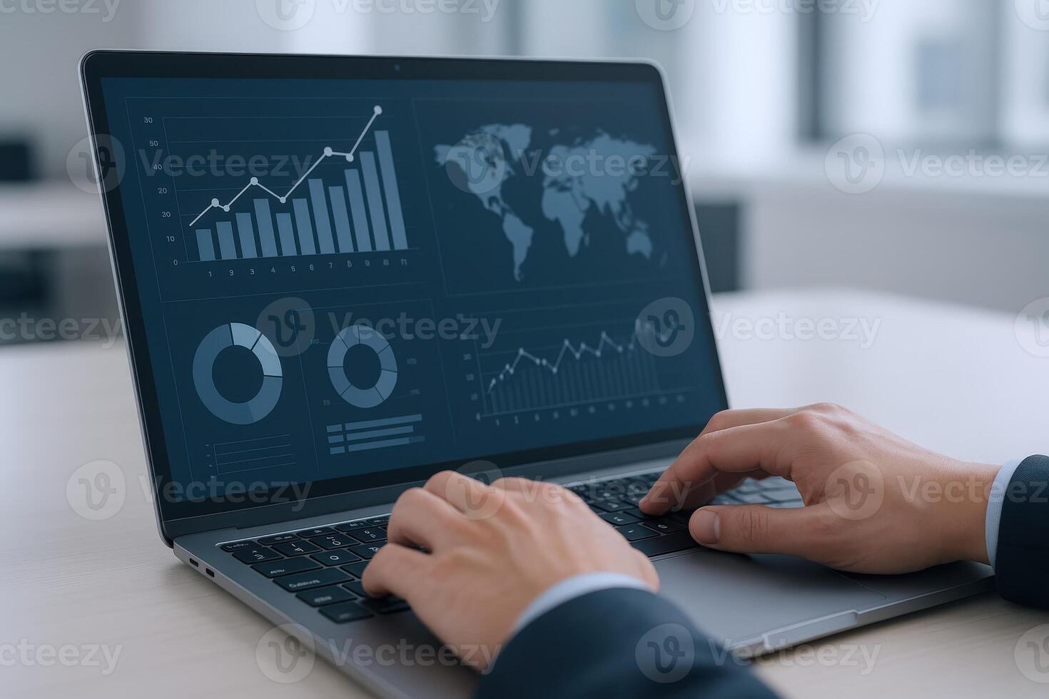 Financial Data Analysis on Laptop Screen Displaying Charts and Graphs, Man Typing Report on Keyboard Pro Photo