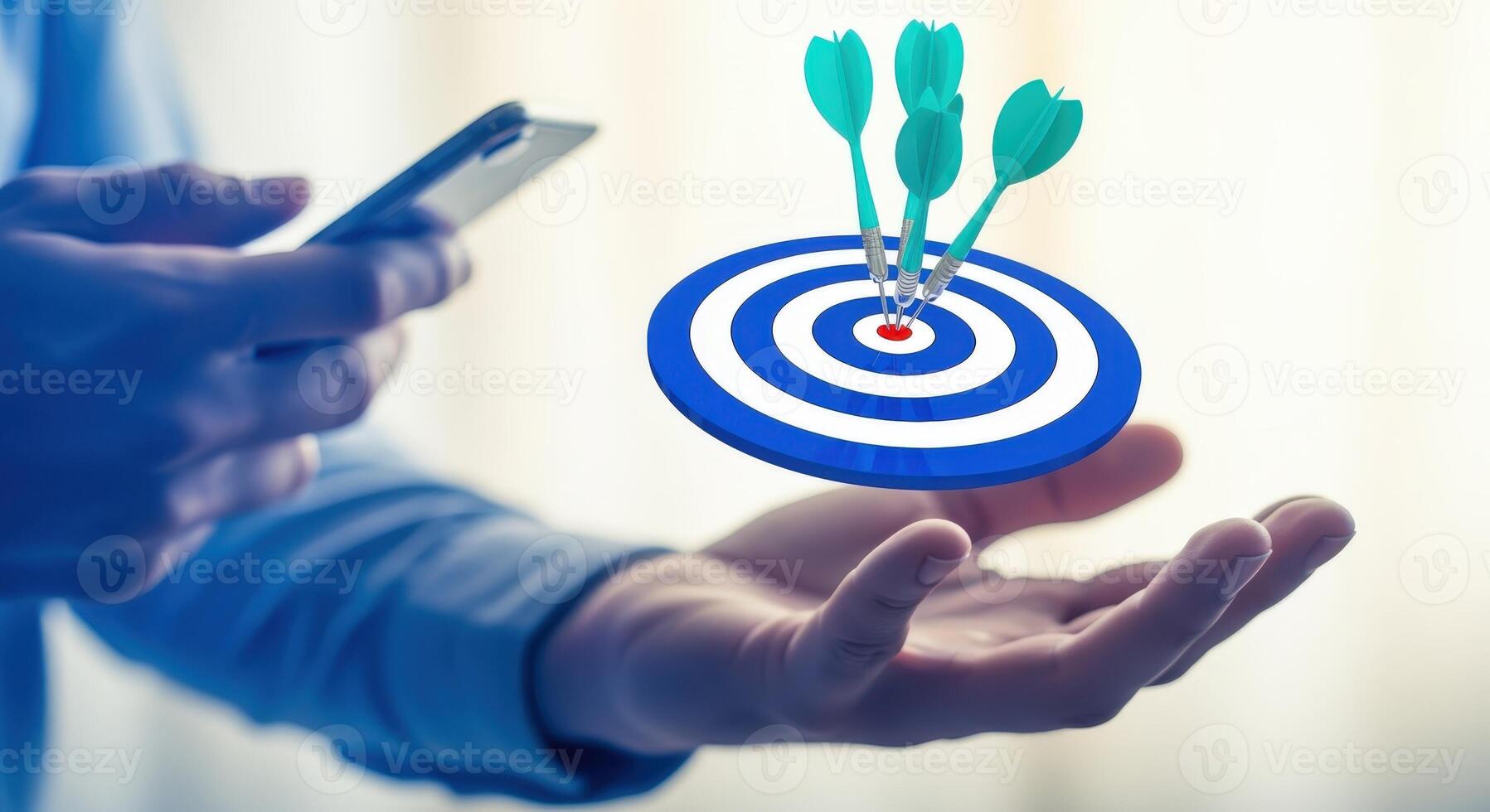 Achieving Business Goals Target Board Hovering Over Hand Using a Mobile Device, Strategy, and Success Pro Photo