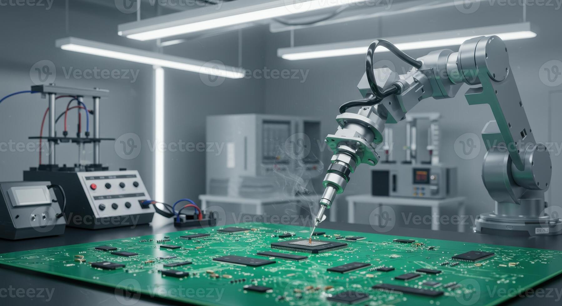 Robotic arm soldering microchip on green circuit board in high tech electronics laboratory Pro Photo
