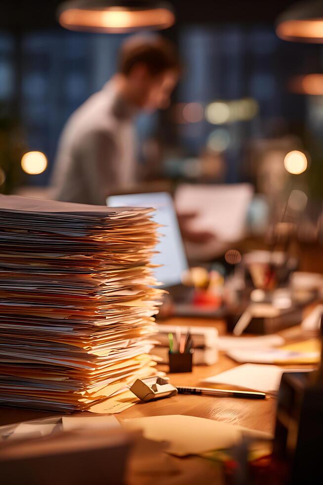 Stack of Documents on Desk with Person Working at Computer Free Photo