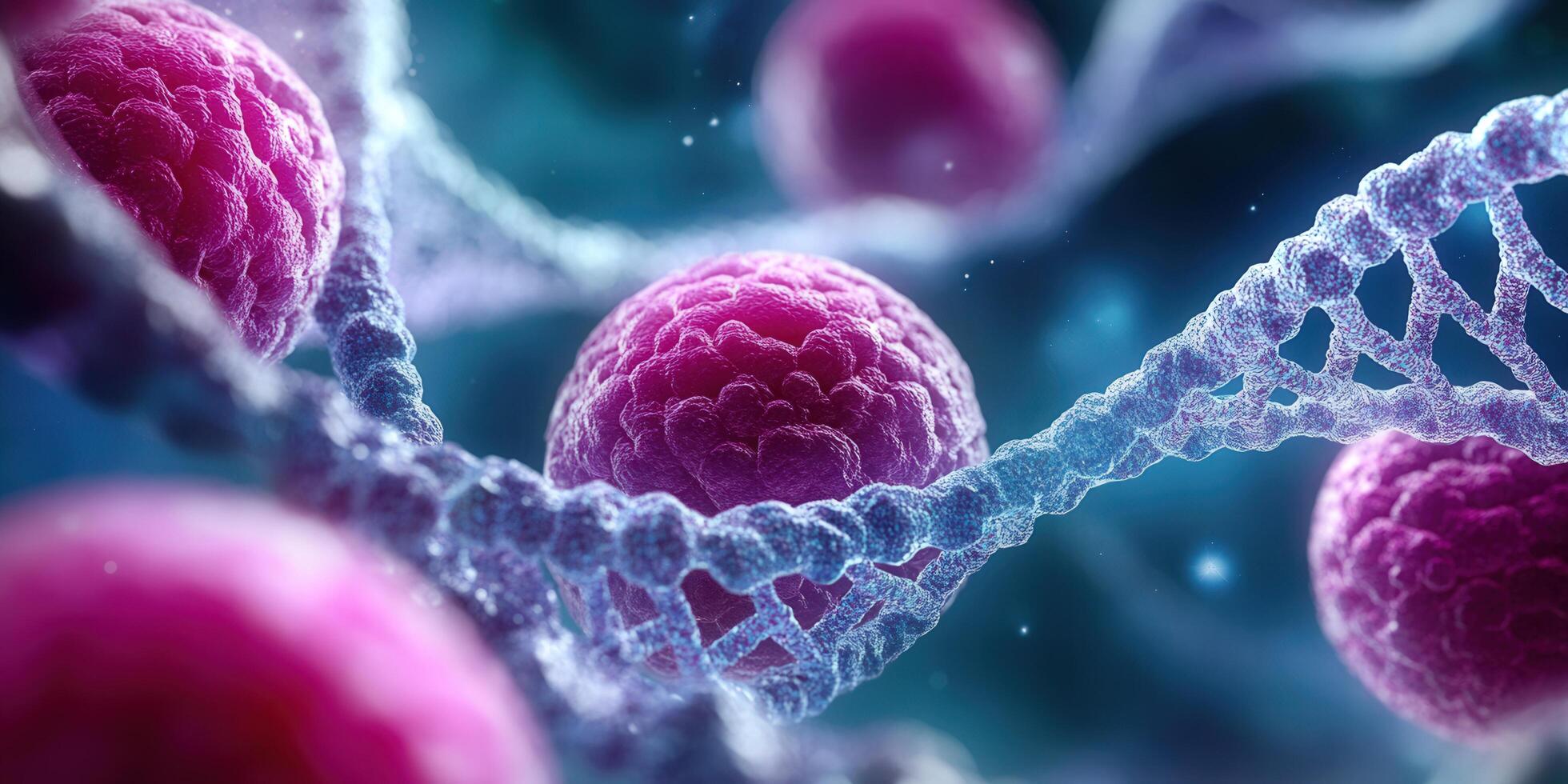 A close-up view of cellular structures, with DNA strands intertwined, representing scientific research photo