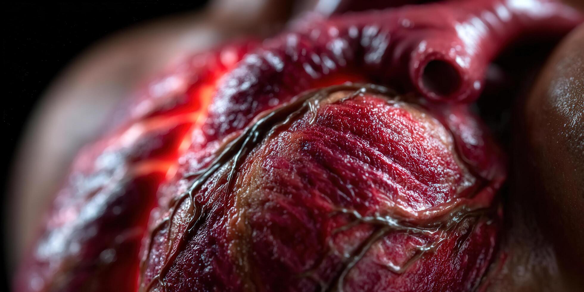 Detailed view of a human heart model, highlighting its complex structures and reddish hues. Free Photo