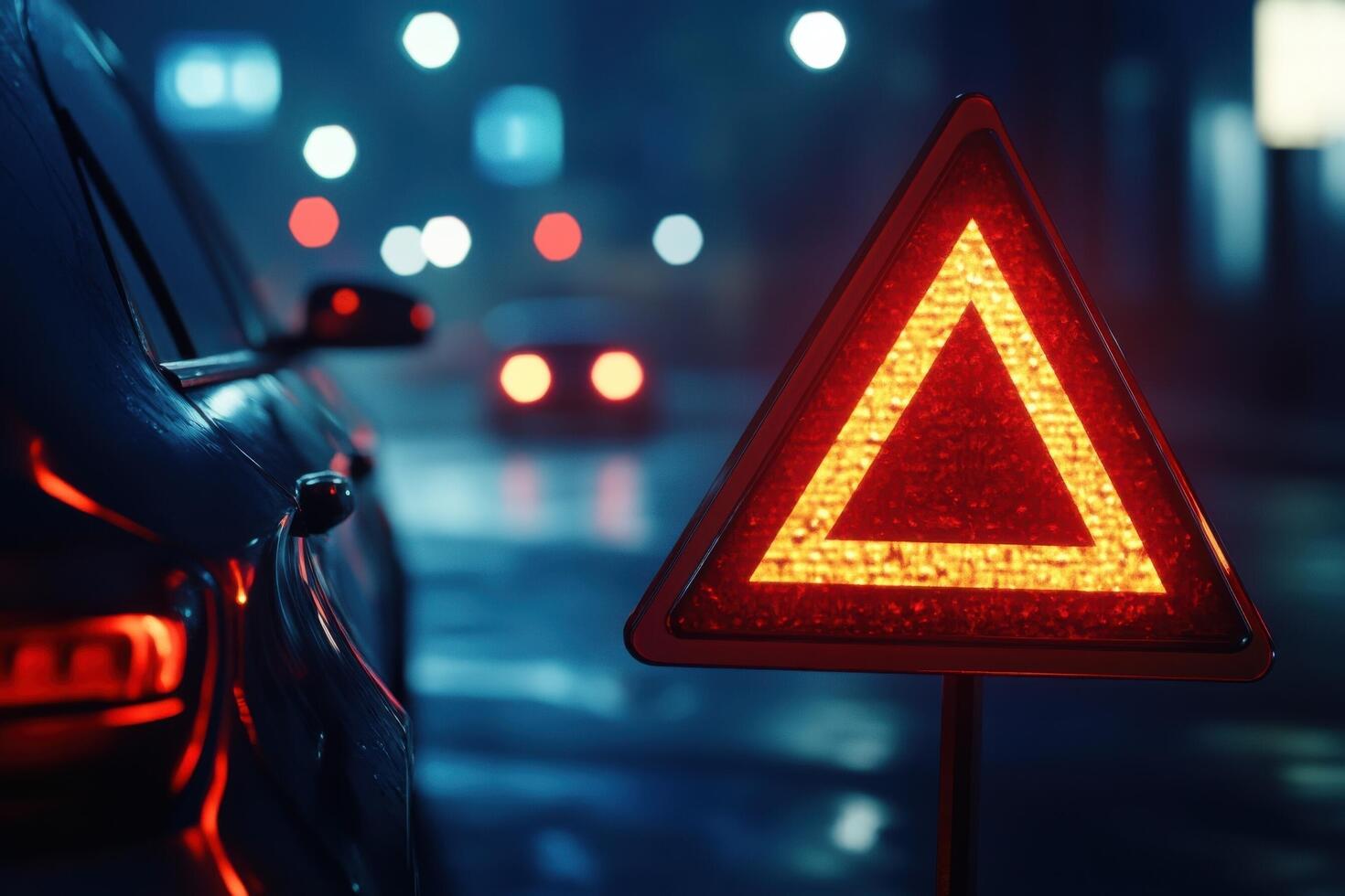 A red warning triangle is shown in front of a car Free Photo