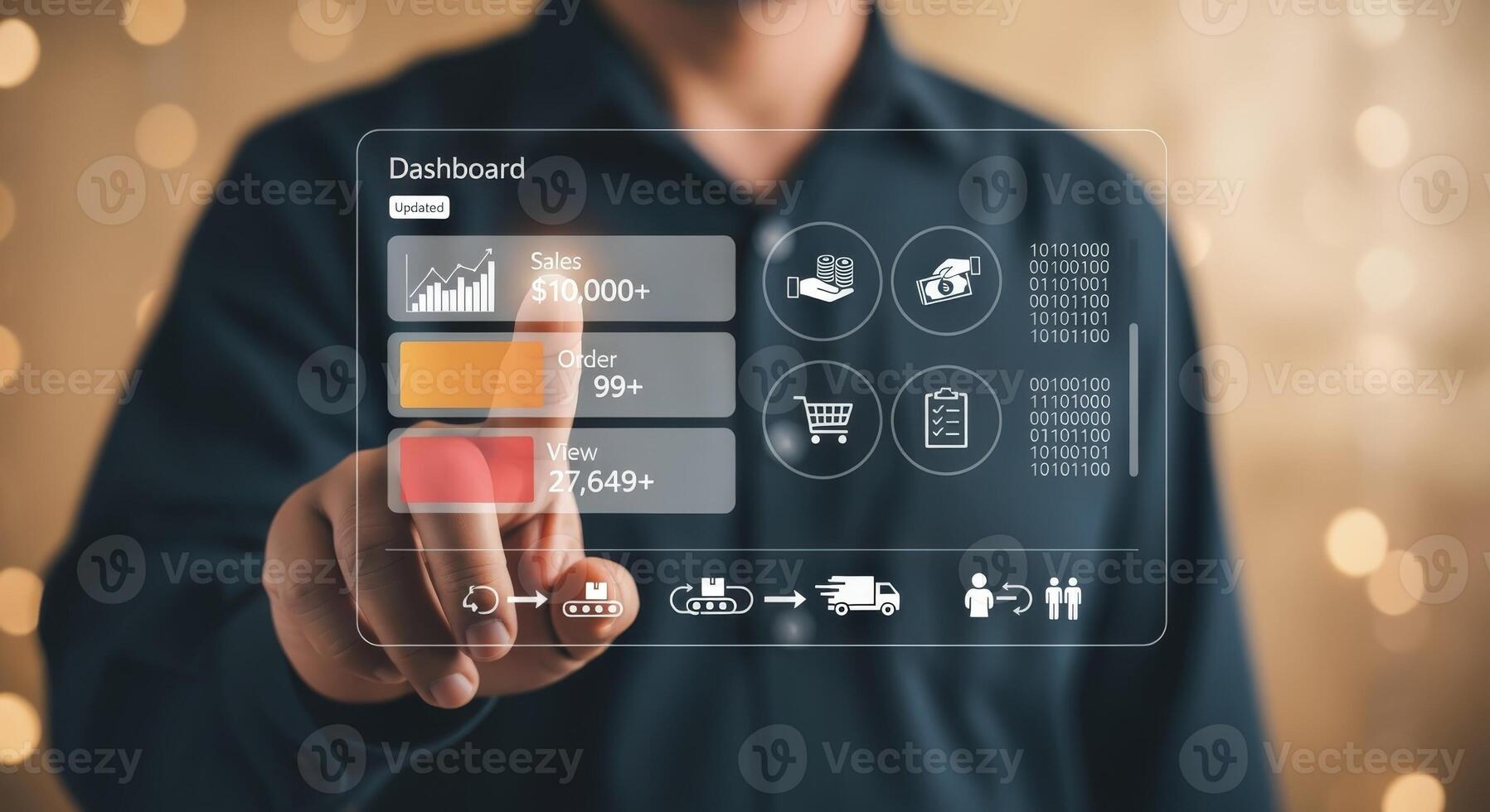 Digital business management, businessman using virtual screen dashboard, sales data analysis and planning, modern technology innovation Pro Photo
