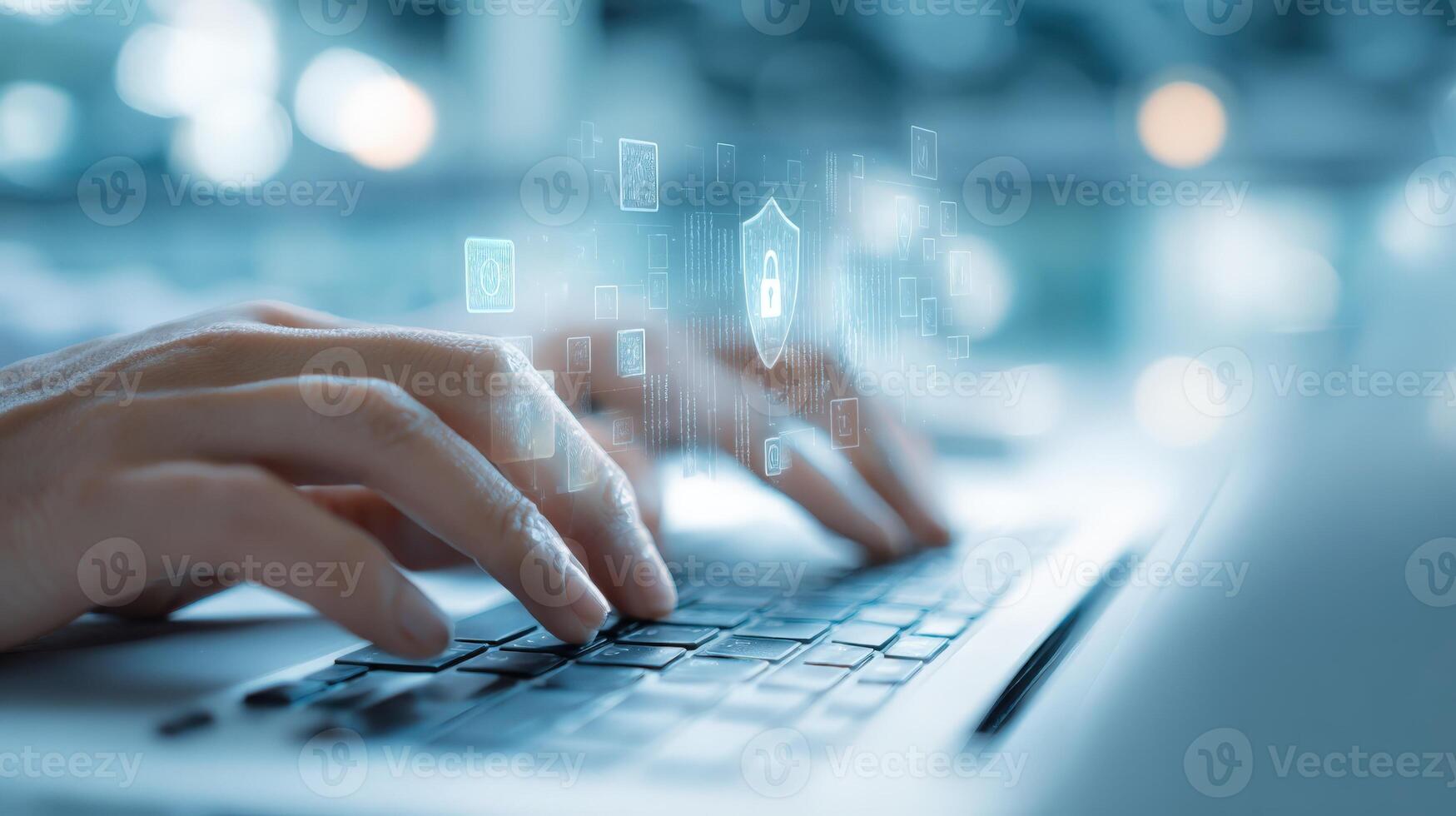 Typing on Laptop with Cybersecurity Icons Protecting Digital Data Through Technology Pro Photo