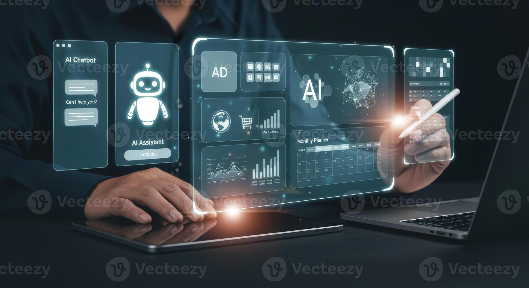 AI Driven Marketing Automation Businessman Interacting with Futuristic Interface Displaying Data Analytics and Chatbot Technologies Pro Photo