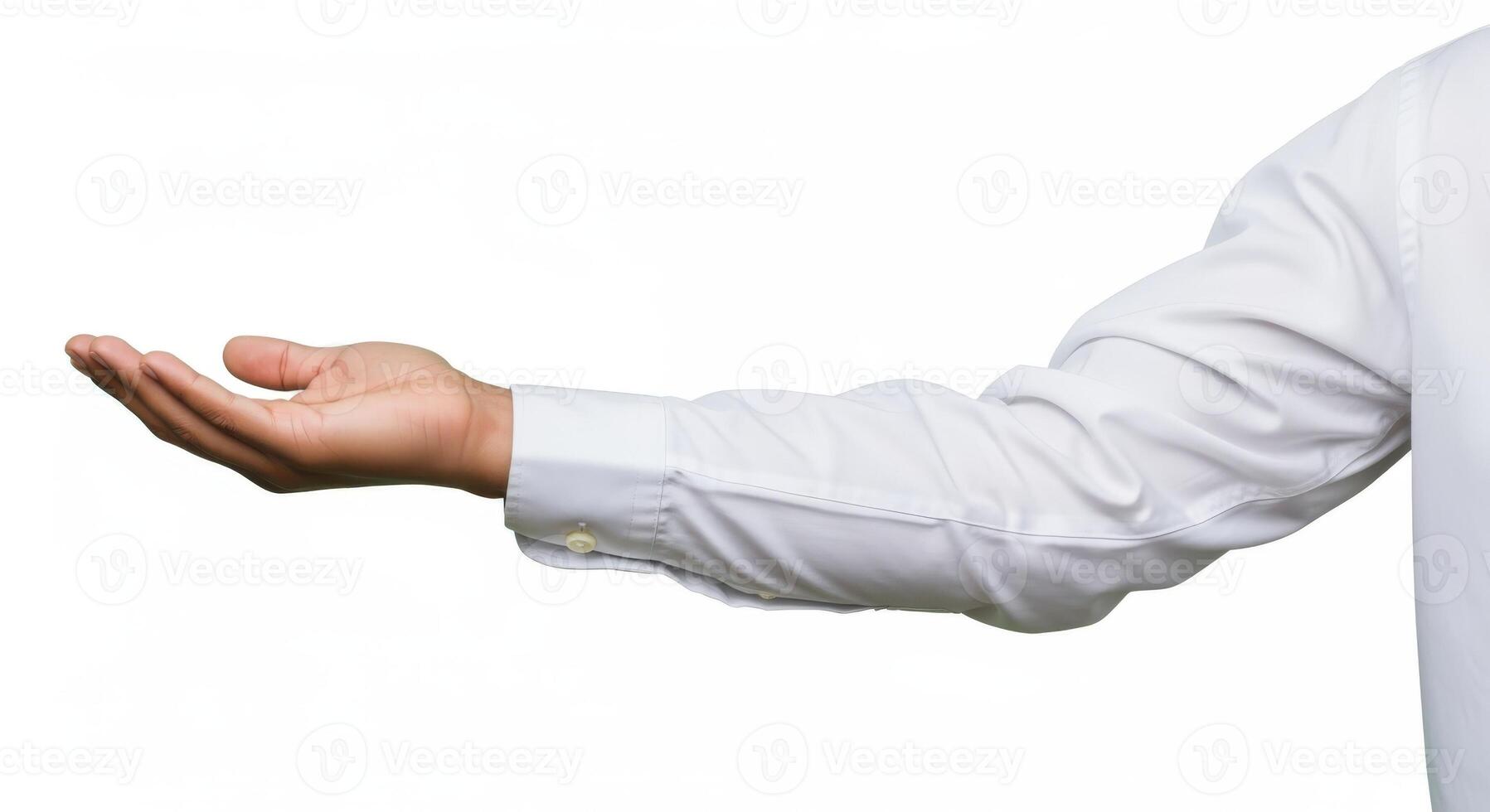 Open Palm Offering Mans Hand Gesturing Presentation Isolated on White Background, Product Display or Assistance Concept Pro Photo