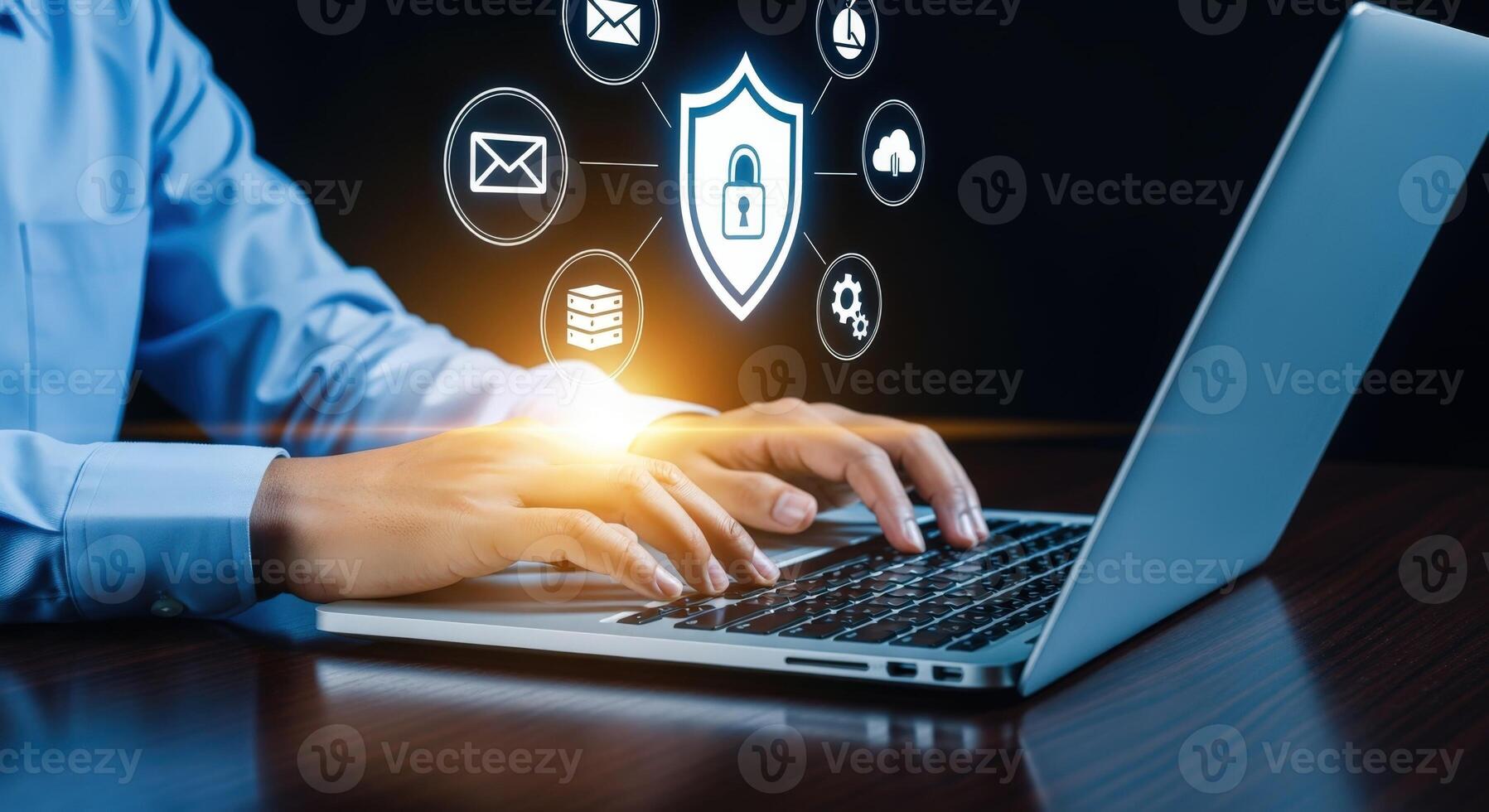 Data protection concept with person using laptop with digital shield icon on screen Pro Photo
