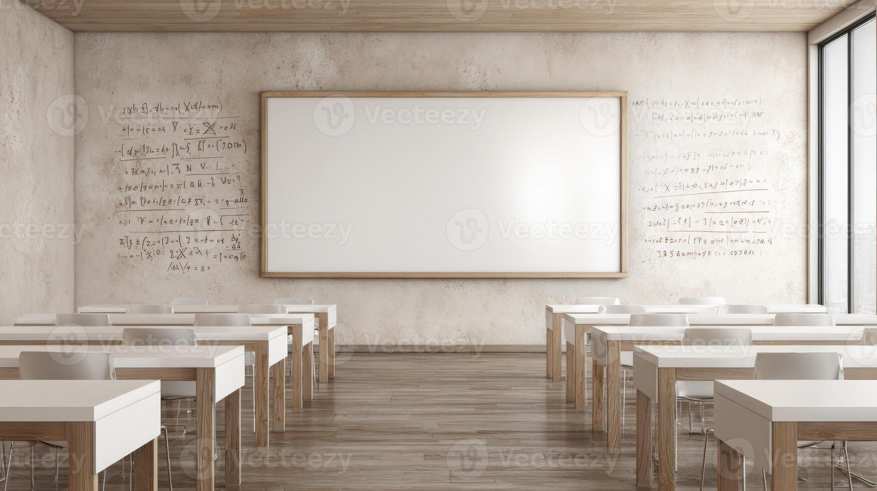 Classroom with Empty Whiteboard and Desks for Educational Mockups and Presentations in Modern School Pro Photo