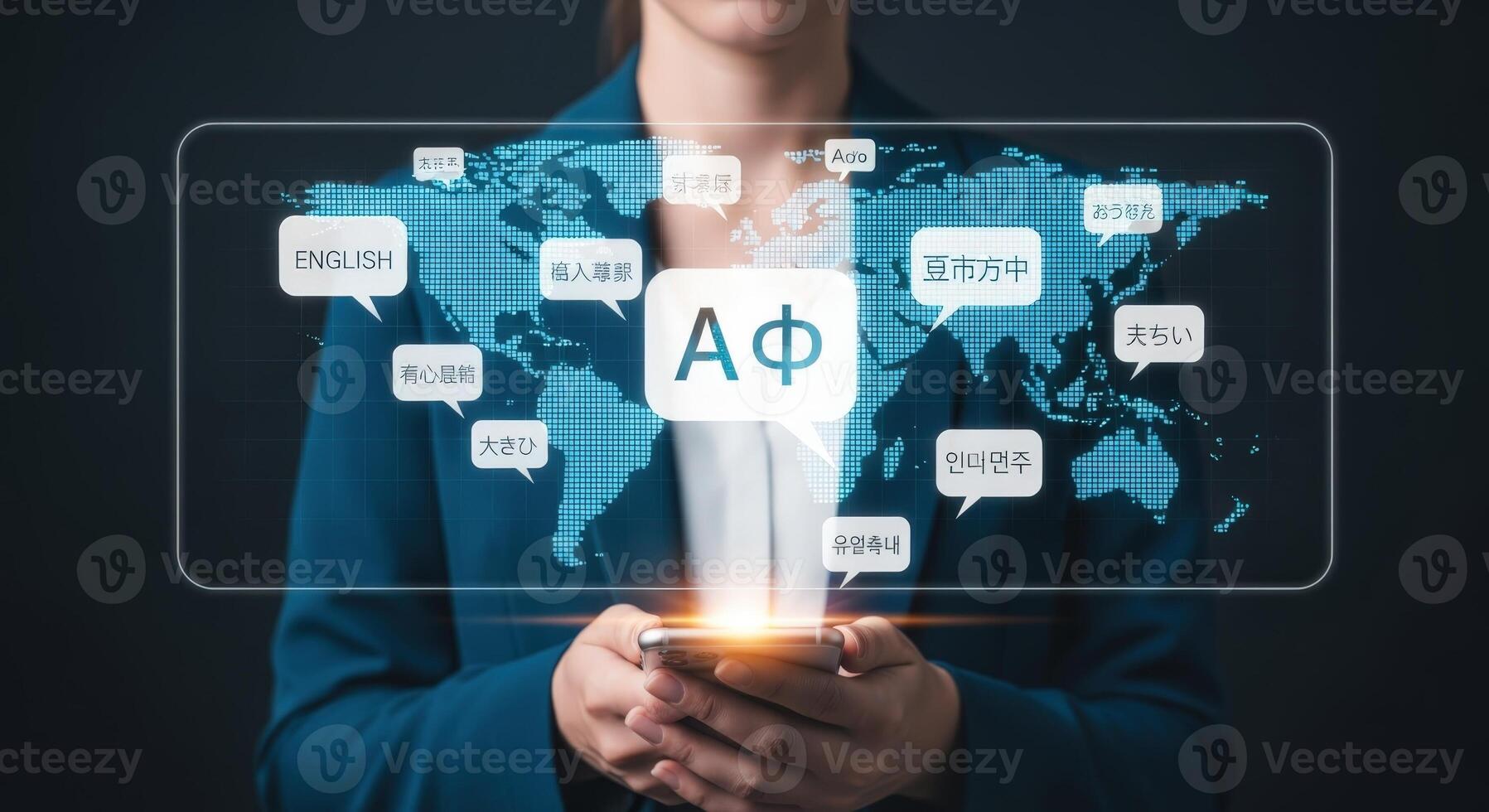 Woman Uses Smartphone App for Language Translation with World Map Visualization on Digital Interface Pro Photo