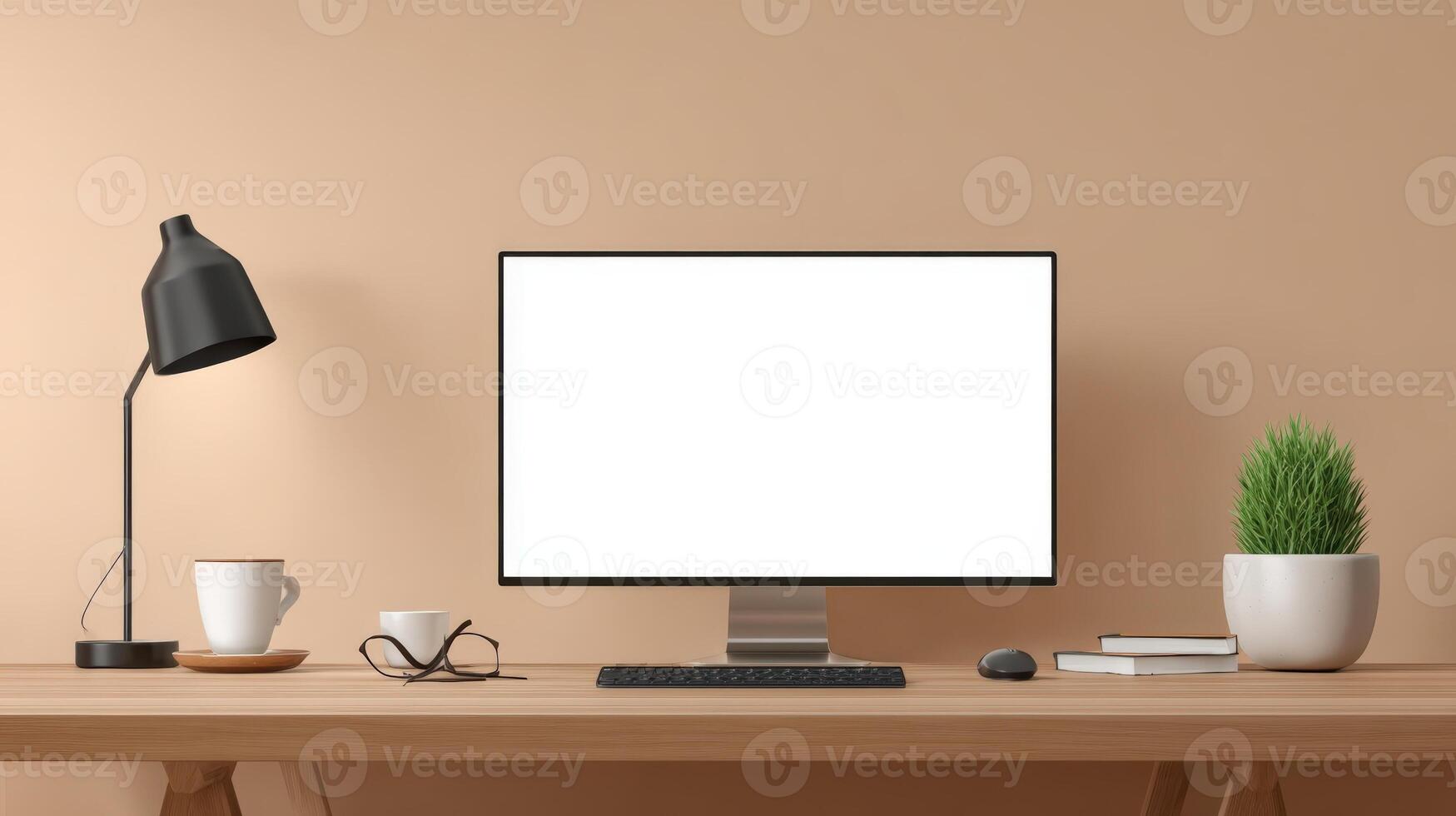 Modern Workspace Mockup with Blank Computer Screen, Minimalist Desk Setup for Business and Design Concepts Pro Photo