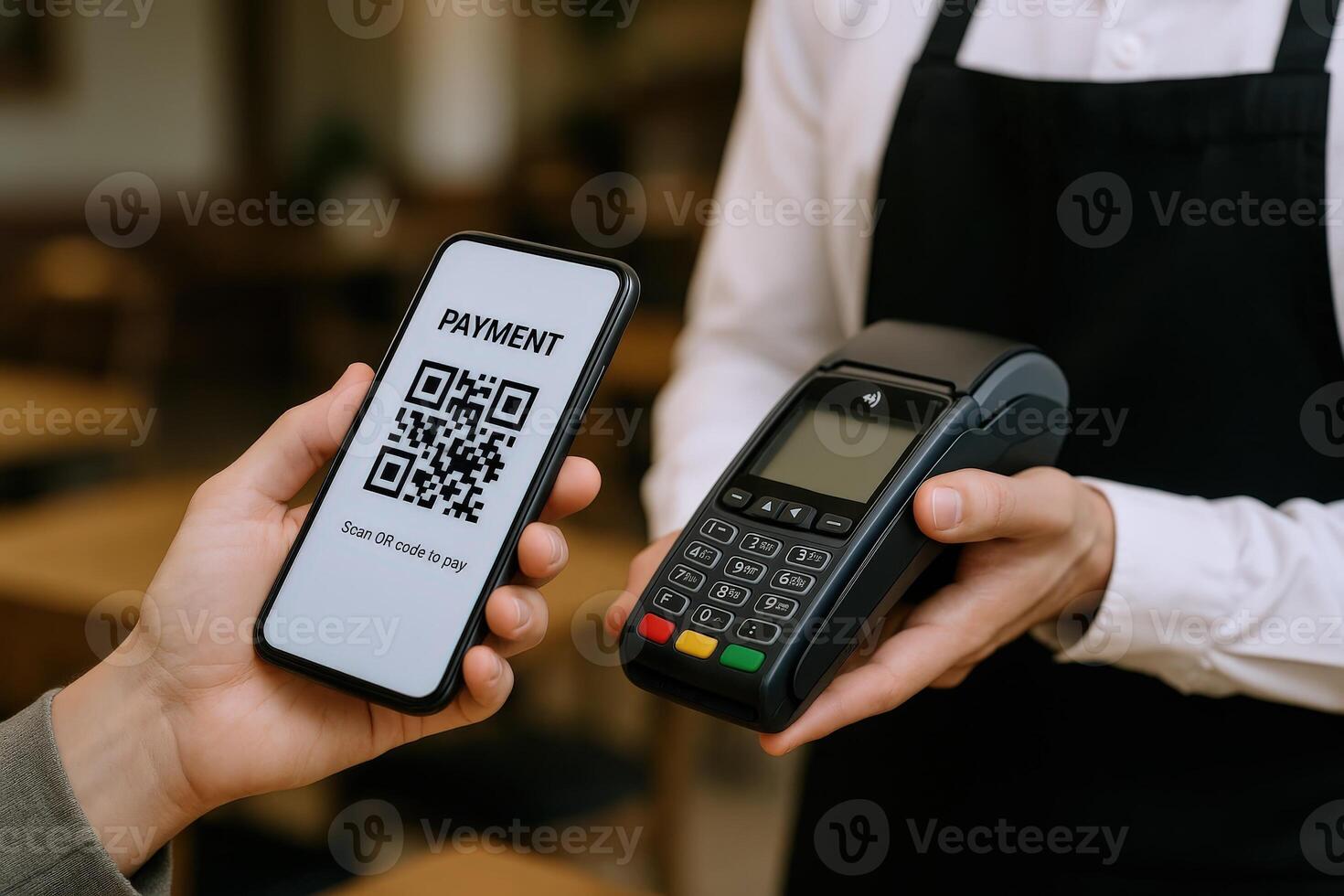 Contactless Payment via QR Code and POS Terminal for Seamless Transactions in a Modern Setting Pro Photo