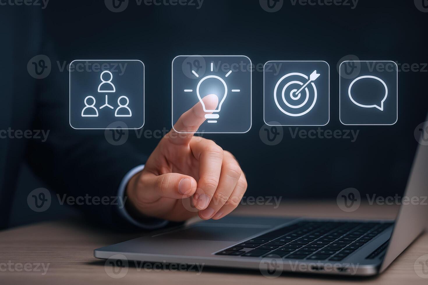 Digital Innovation Business Person Tapping Lightbulb Icon on Interactive Interface Displaying Teamwork, Goal, and Communication Pro Photo