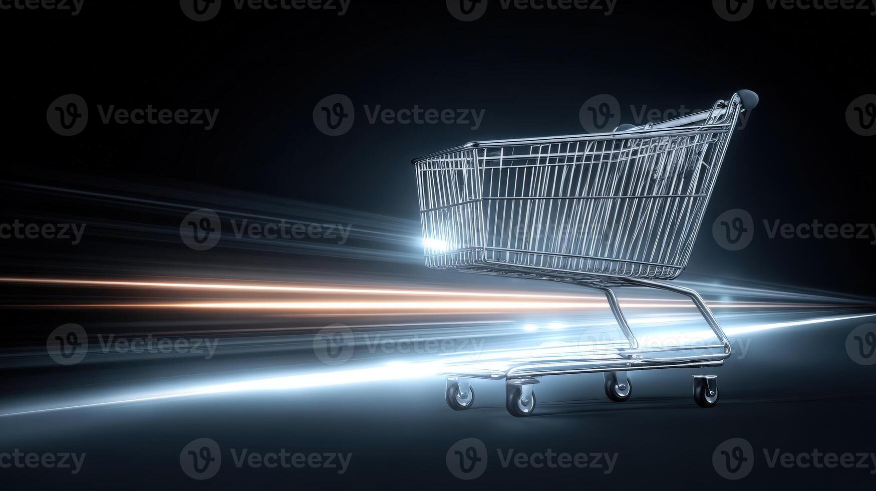 Empty Shopping Cart Speeding with Motion Blur Streaks on Dark Background Representing Fast Delivery or Online Shopping Pro Photo