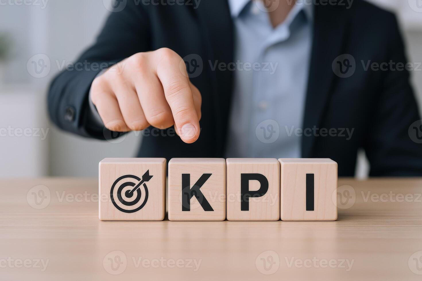 Demonstrating Key Performance Indicators Person Points to KPI Blocks for Business Success and Goal Achievement Pro Photo