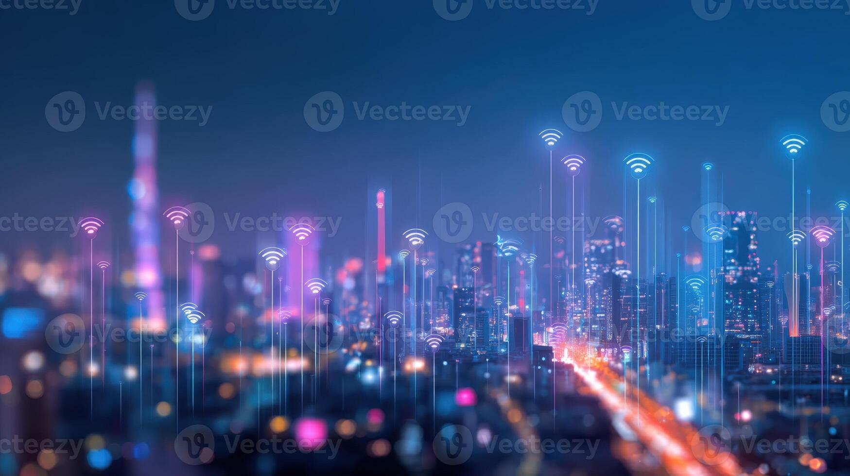 Smart Cityscape at Night with Wireless Communication Network and Data Transmission via Futuristic Connection Pro Photo