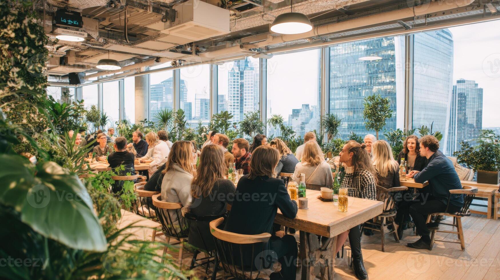 Modern Office Space with Greenery and City Views People Networking and Collaborating at Tables Pro Photo