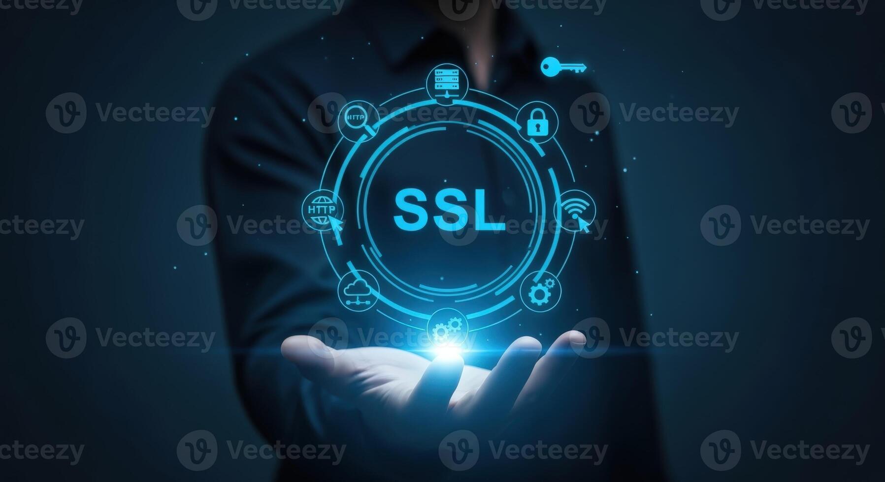 SSL Certificate Protection Concept Man Holding Hologram Display for Online Security, Encryption and Secure Data Pro Photo