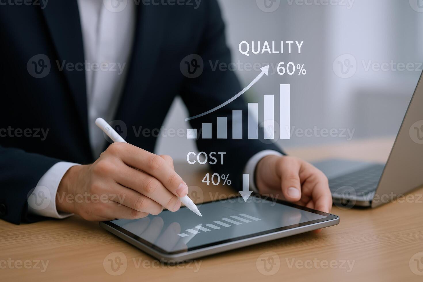 Business Professional Analyzing Growth Data on Tablet Displaying Quality Increase and Cost Reduction Metrics Pro Photo