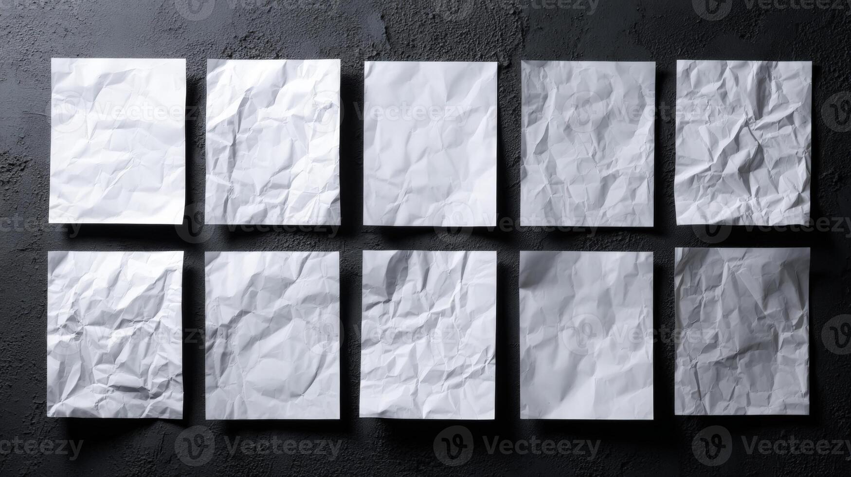 Ten Square Crumpled White Paper Sheets Arranged on a Dark Textured Background, Ideal for Mockups and Creative Projects Pro Photo