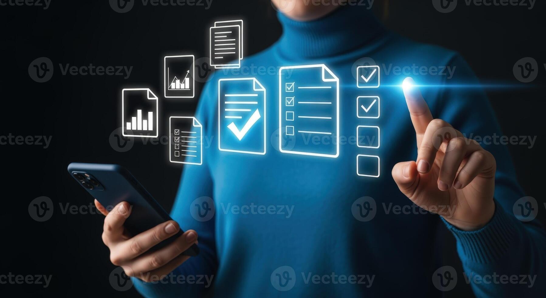 Woman using digital interface for data analysis and document management on a smartphone Pro Photo