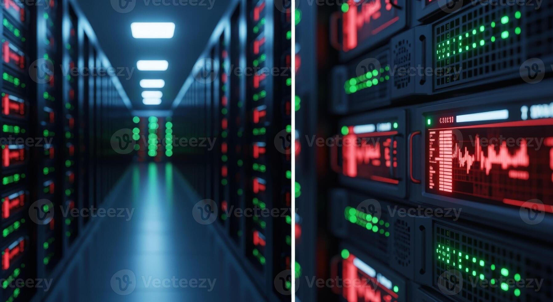 Server Room Data Center with Rack Servers and Network Equipment for Cloud Computing Pro Photo
