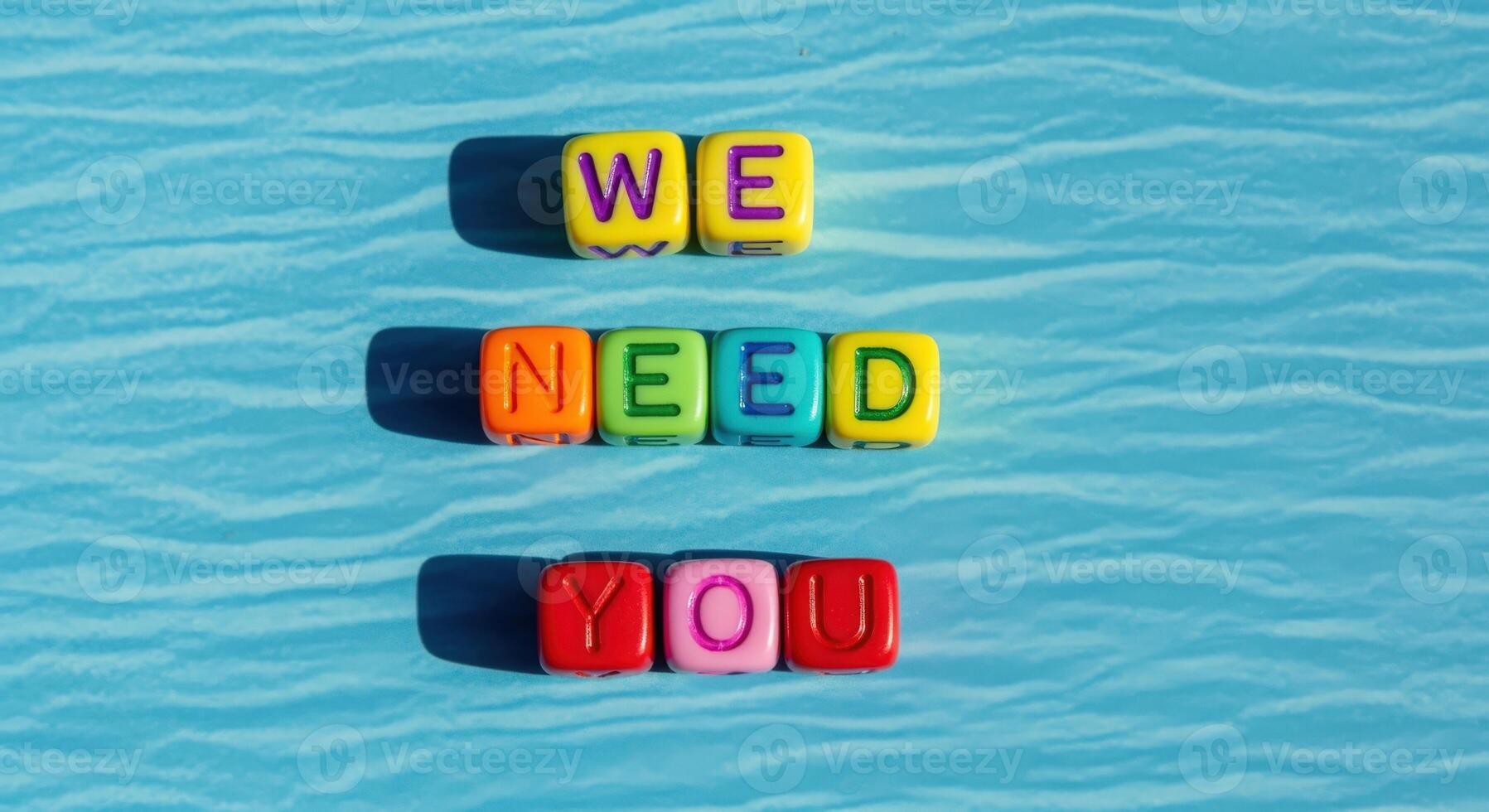 Conceptual We Need You message with colorful blocks on a bright blue textured backdrop Pro Photo