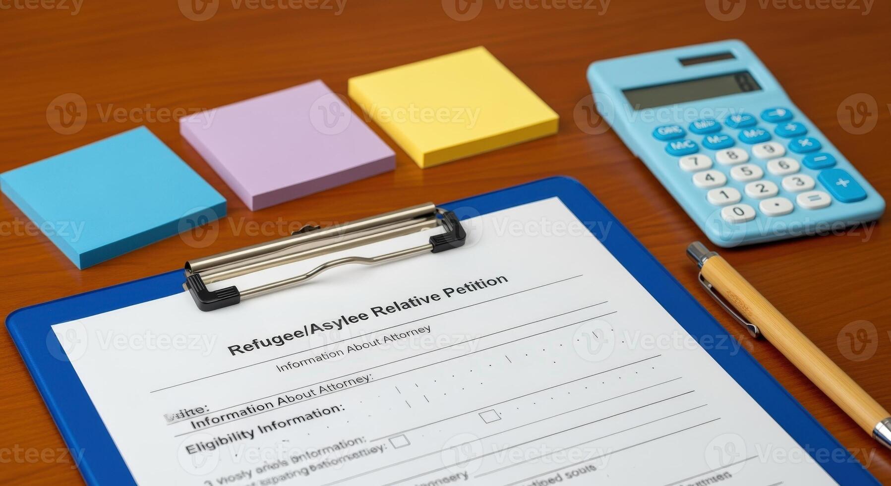 Asylum Application Form on Clipboard with Pen, Calculator and Sticky Notes on Wooden Desk Pro Photo