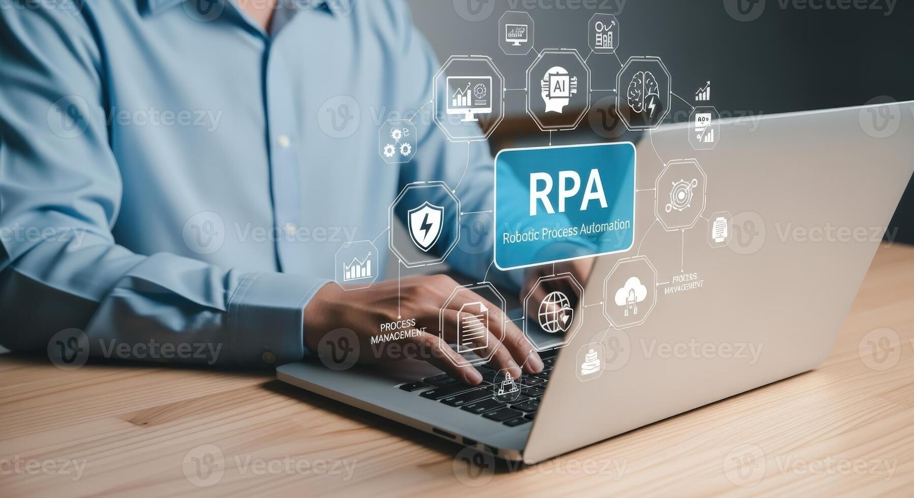 Man Working on Laptop with RPA Robotic Process Automation Technology for Business Efficiency Pro Photo