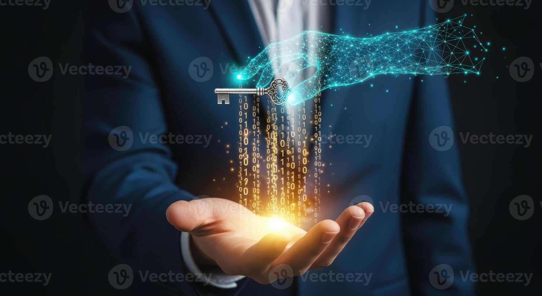 Digital Transformation Business Man Holding Holographic Hand with Key for Cybersecurity Solutions and Encryption Pro Photo