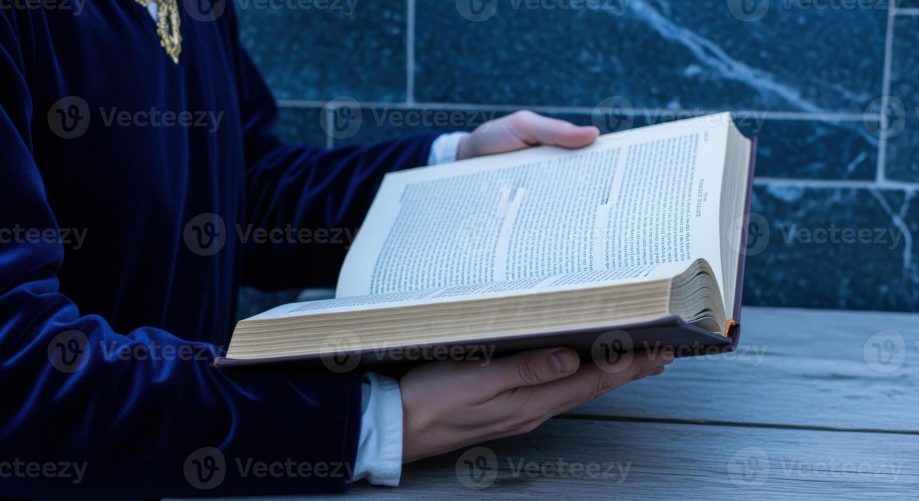 Person Reading an Open Antique Book with Detailed Script on Textured Table Background Pro Photo