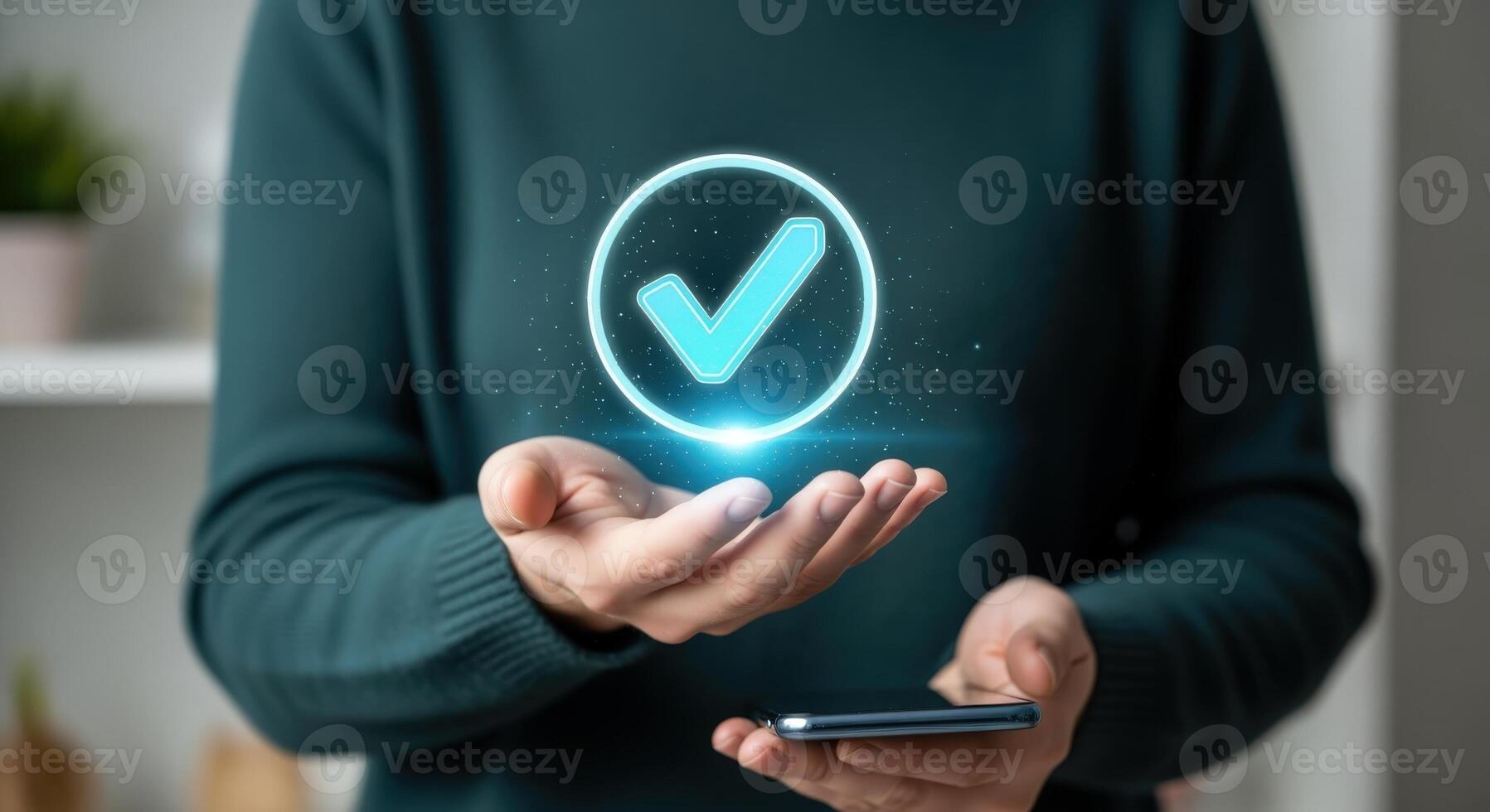 Person Holding Smartphone Displaying Glowing Check Mark Hologram, Representing Approval and Digital Validation Pro Photo