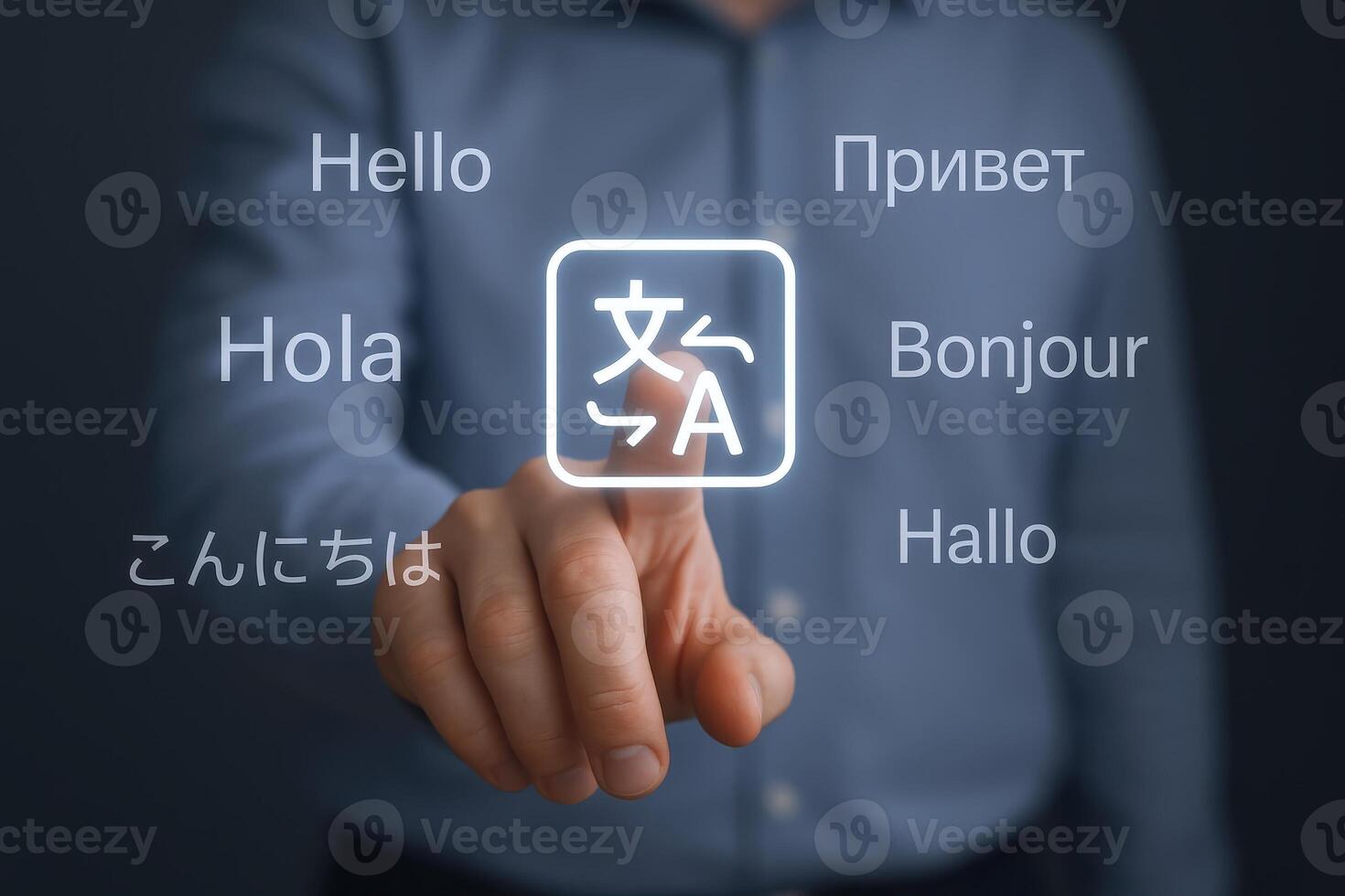 Conceptual Image of Language Translation App, Featuring a Hand Touching Icon on a Digital Interface Pro Photo