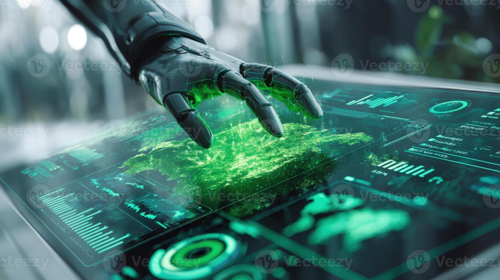 Advanced Robotic Arm Interacting with a Futuristic Touchscreen Display Showing Complex Data and Green Energy Visualization Pro Photo