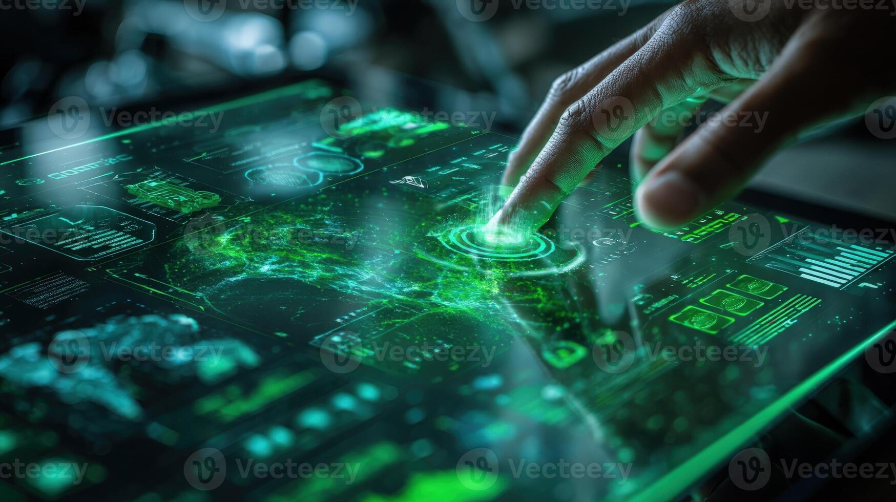 Advanced Technology Interface A User Interacting with a Futuristic Green Digital Display Screen Pro Photo