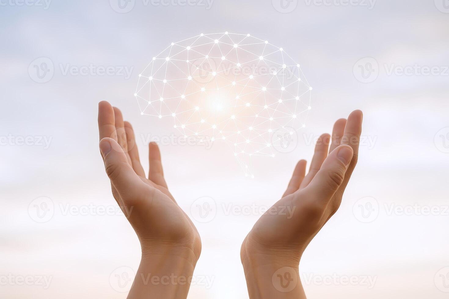 Brain Power Conceptual Image with Hands Holding Digital Brain Network Over Sky, Mental Health and Artificial Intelligence Pro Photo