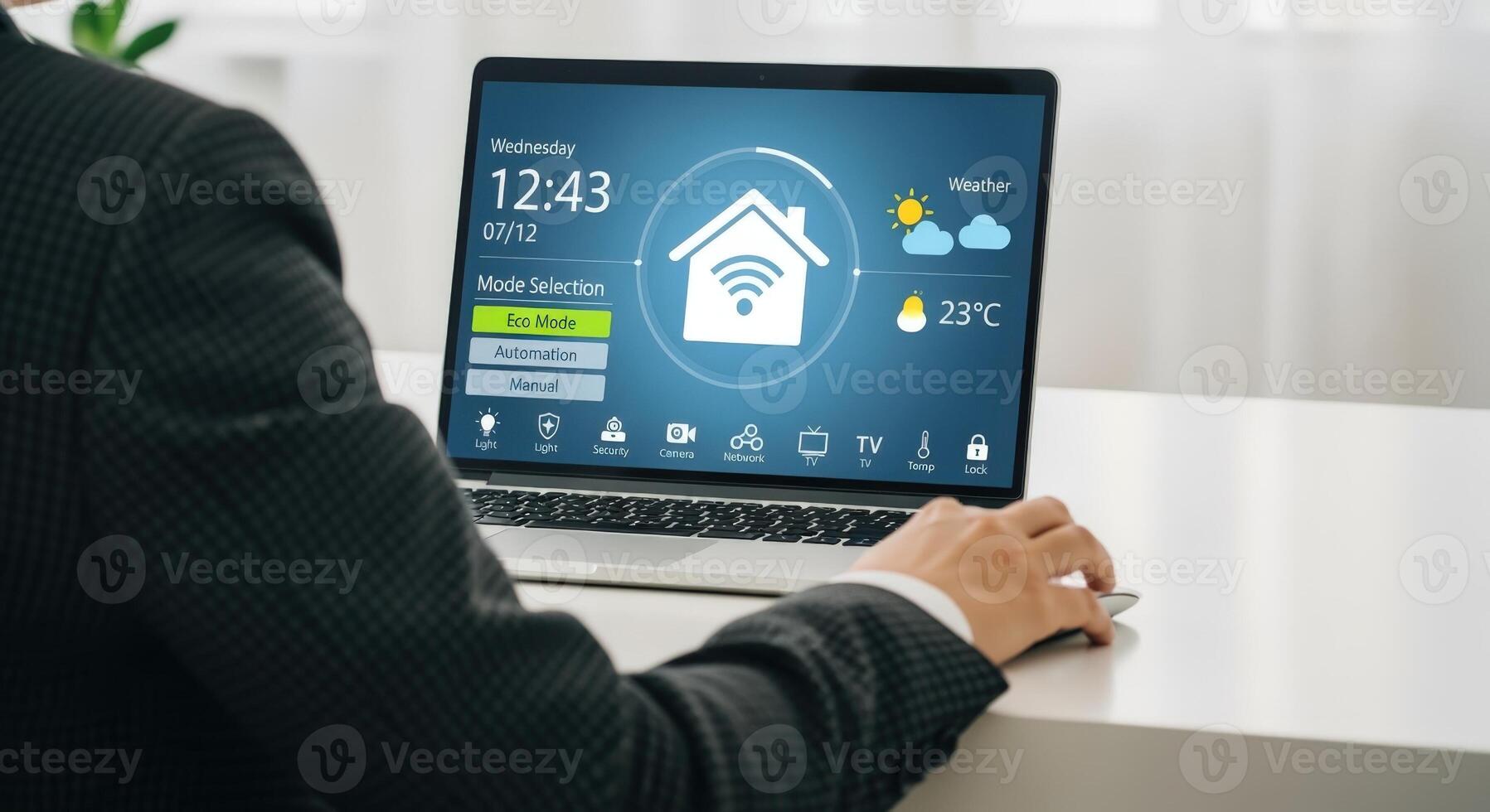 Smart Home Automation System Interface on Laptop Screen Displaying Control and Monitoring Features for Modern Living Pro Photo