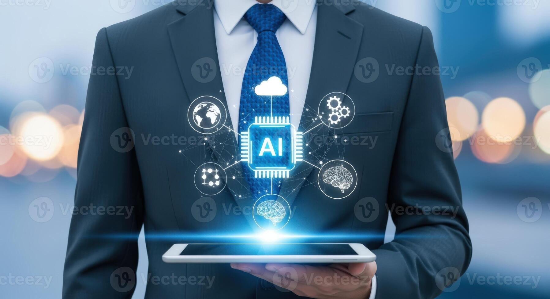 Businessman Holding Tablet Displaying Artificial Intelligence Network Future Technology and Smart Solutions Concept Pro Photo