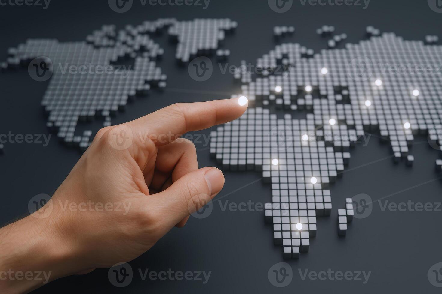 Global Network Connection Concept Persons Finger Indicates Worldwide Digital Transformation and Interconnectedness on Pixelated Map Pro Photo